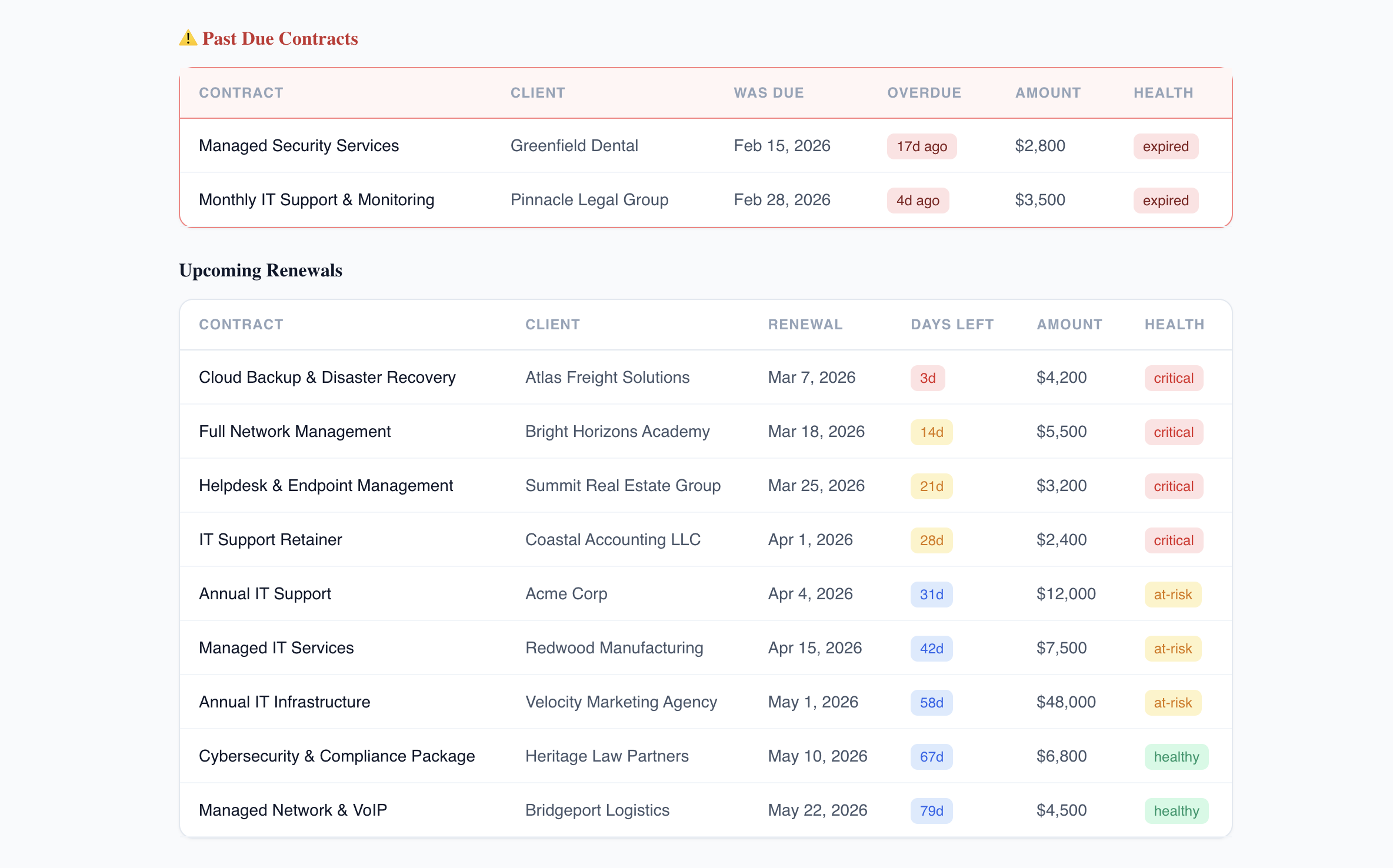 Tracking recurring IT service contracts where a missed renewal means silent client churn.