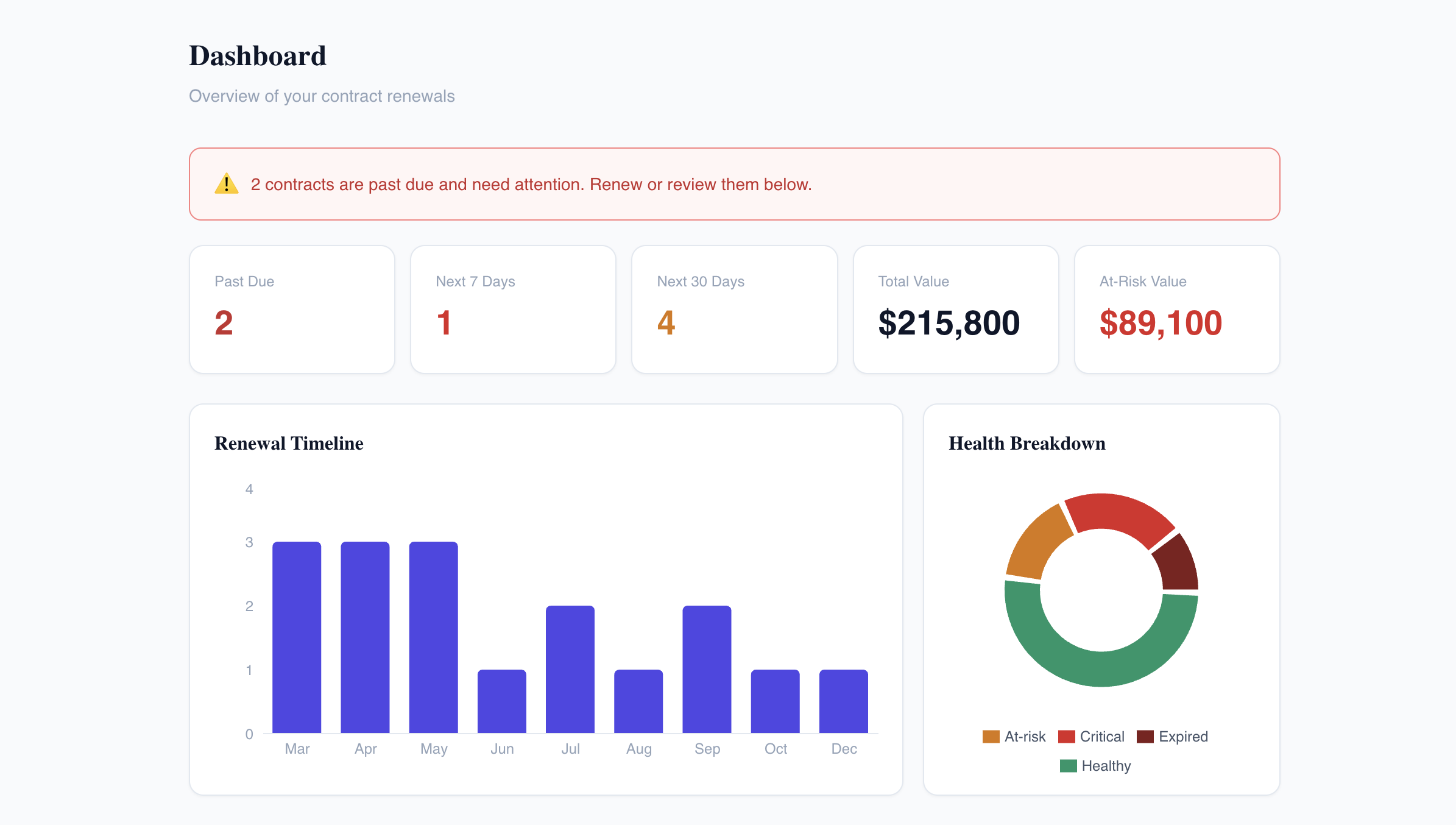 Instantly spot healthy, at-risk, and critical contracts. Know exactly which clients need a conversation today.